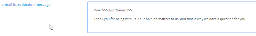 These three variables can be used to personalize your survey. For example in the introduction text of your emails or in the questions. This allows you to address someone with his/her name or to mention his/her e-mail address.