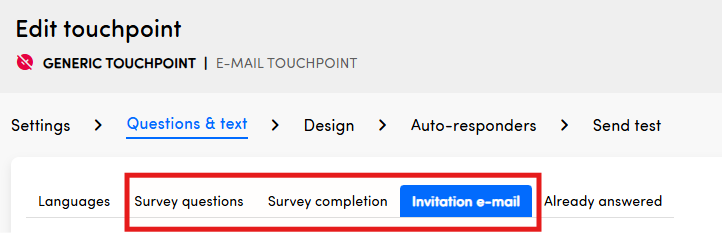 Touchpoint > Settings > Questions & text > Survey questions OR Invitation e-mail OR Invitation e-mail