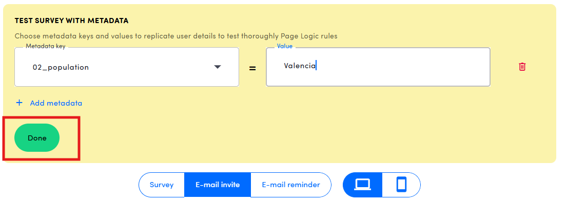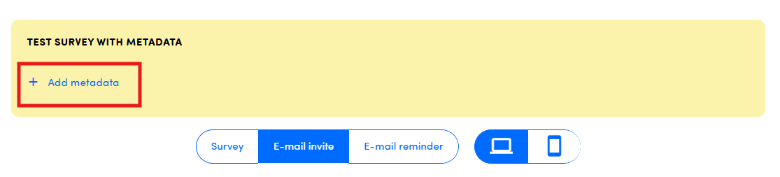 - Click "+ Add metadata" on TEST SURVEY WITH METADATA