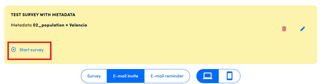 - In the updated preview screen, click on the Start survey link highlighted in the interface. This step applies the test metadata to the survey preview.
