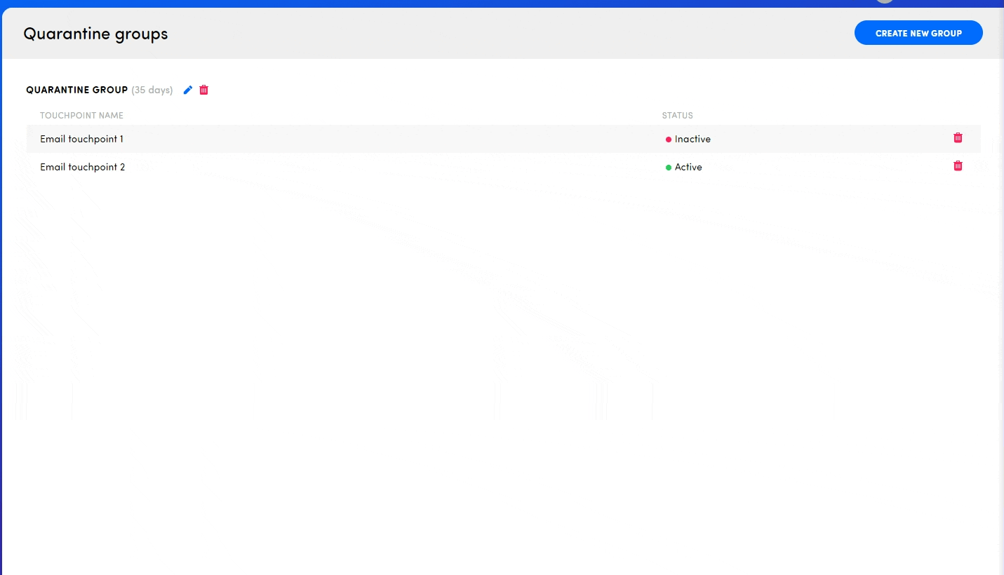 - You can remove a touchpoint from the group. In case you delete a touchpoint from a group, the quarantine period for that specific touchpoint will be activated again. You can either do this in the edit screen of the group or by using the trash can next to the touchpoint on the overview page.