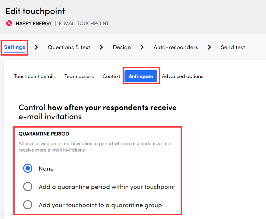 STEP 3: Navigate to the Anti-spam tab located on the Settings section of the Edit Touchpoint page. There you can enable a quarantine period and select a period of time (1 day by default) from the dropdown that appears after the enabling of the quarantine period (or add it to a quarantine group).