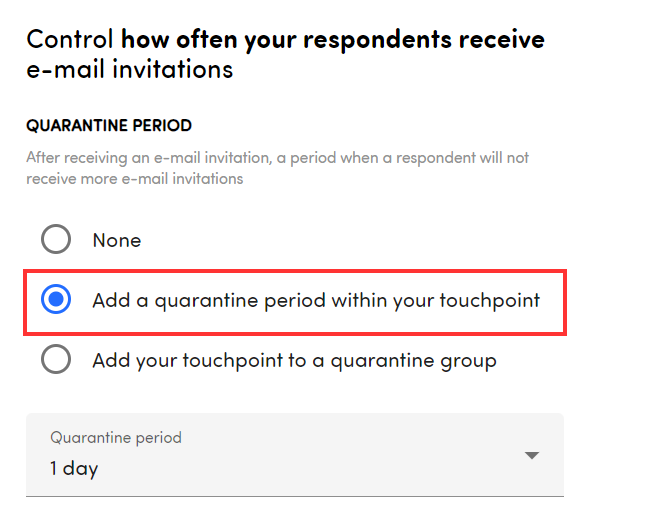Imagine a quarantine period that is set to 1 week. Joanne receives a survey from your company but has another interaction with your company within that same week. Now, whether Joanne responded or not, she will not receive the second survey as the quarantine period was set to 1 week. This avoids Joanne finding the surveys too spammy and deciding to unsubscribe or report them as spam and will help you engage further in the future.
