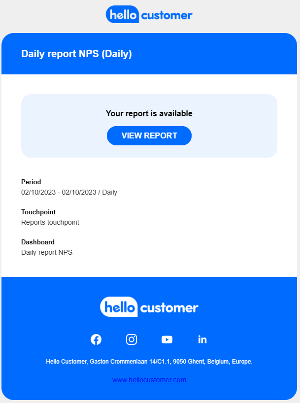 The email will only include a "View Report" button. Clicking it will take the recipient directly to the platform. After logging in, they will see the linked dashboard with the correct date range.