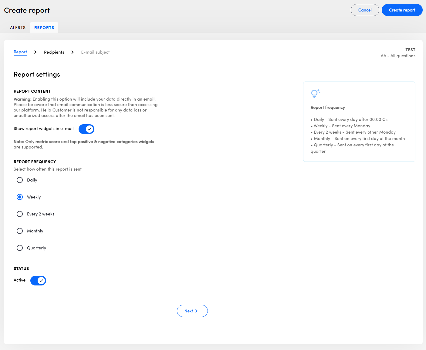 By default, a newly created report is set to active. This means it will be sent to the selected recipients according to the configured schedule—as long as data is available for the specified date range.