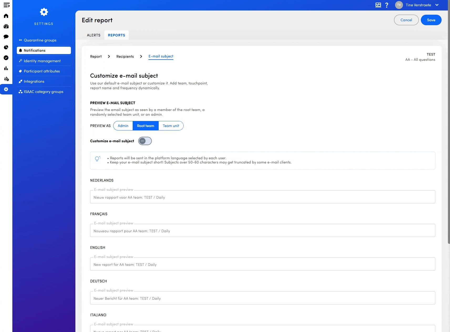 In the final step, you can configure the email subject line of the report email in all user languages. This step is optional—if you choose not to personalize the subject, we’ll use the default format: