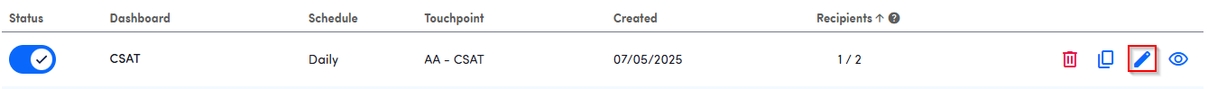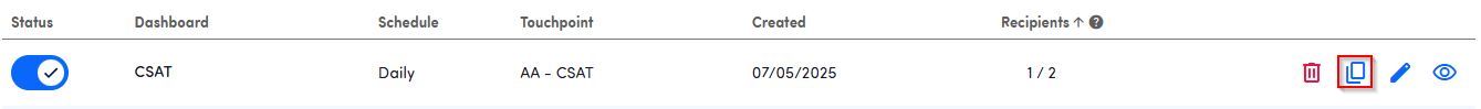 Click the eye icon to open the dashboard with the date range of the most recently sent report. If the report has not been sent yet, the eye icon will not be available.