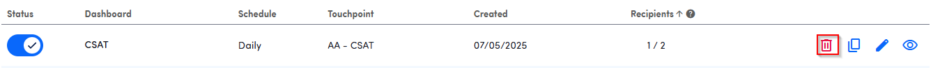 To delete a report, click the trash can icon to the right of the report you want to remove. Once a report is deleted, it will no longer be sent to recipients. This action is permanent and cannot be undone.