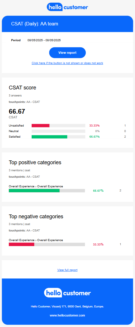 The email will display the first three supported widgets, showing relevant data for the recipient’s team. It will also include a button to view the full report in the platform. After logging in, they will see the linked dashboard with the correct date range.