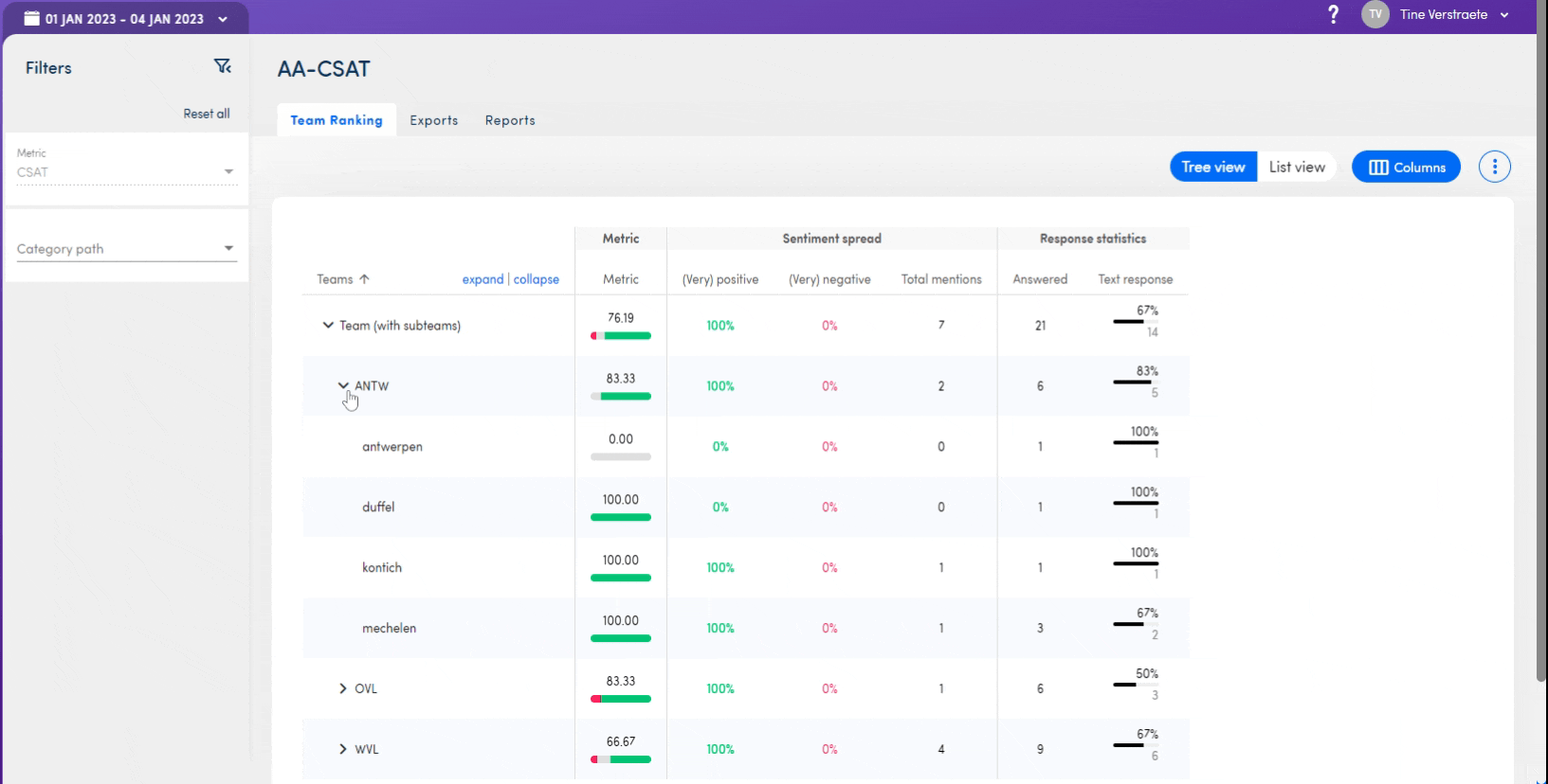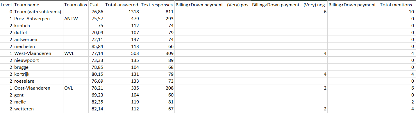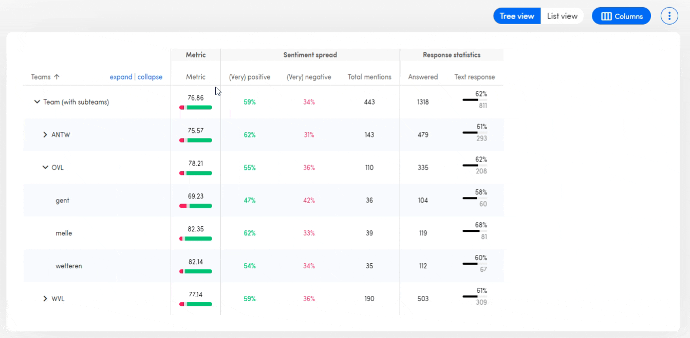 You can also sort on every column in the table. That makes it easy to rank your teams in different ways, for example on the NPS or on response rates. When sorting in the tree view, everything is sorted within the same level. So in the example below, ANTW, OVL and WVL will be sorted against each other and within OVL Melle, Gent and Wetteren are sorted from high to low / low to high.