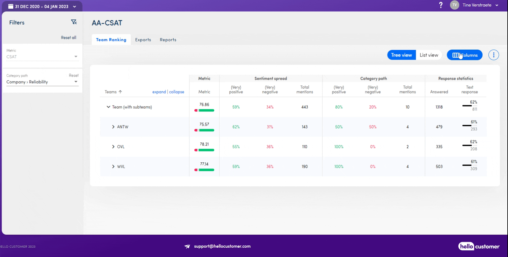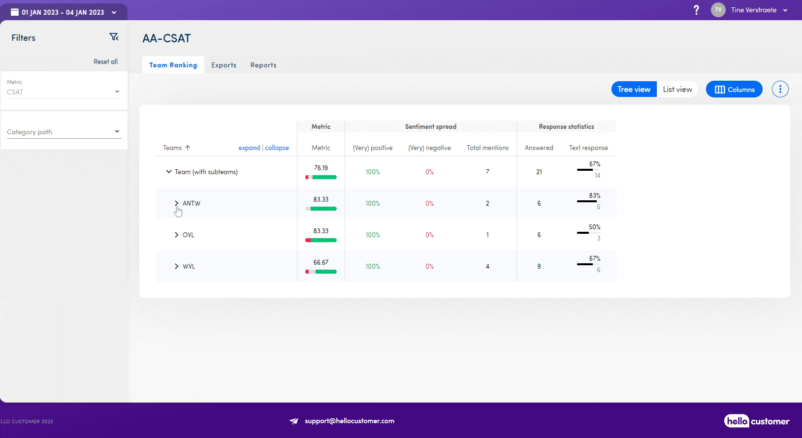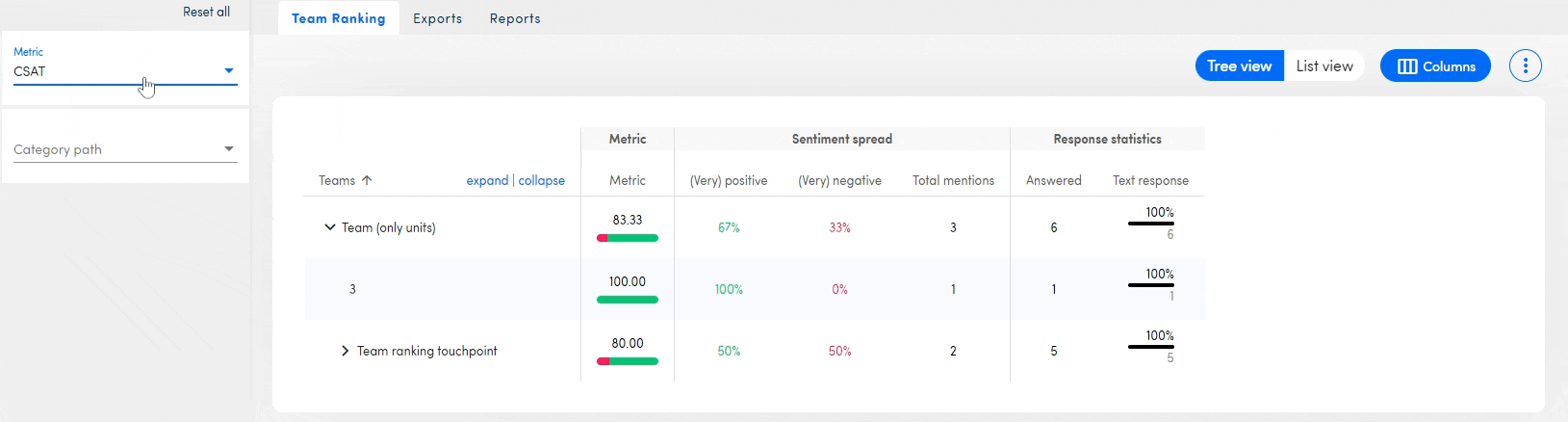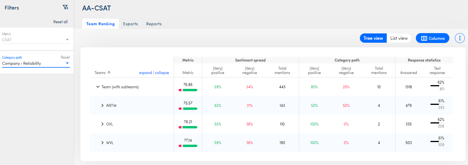 On the team ranking page, you can compare your teams to each other. The team structure will be shown on this page as you set it up in the settings of the platform. You can compare your teams on different items: the score on the metric question (CES / CSAT / CES), the overall sentiment spread, the response rate statistics and a specific ISAAC category path.