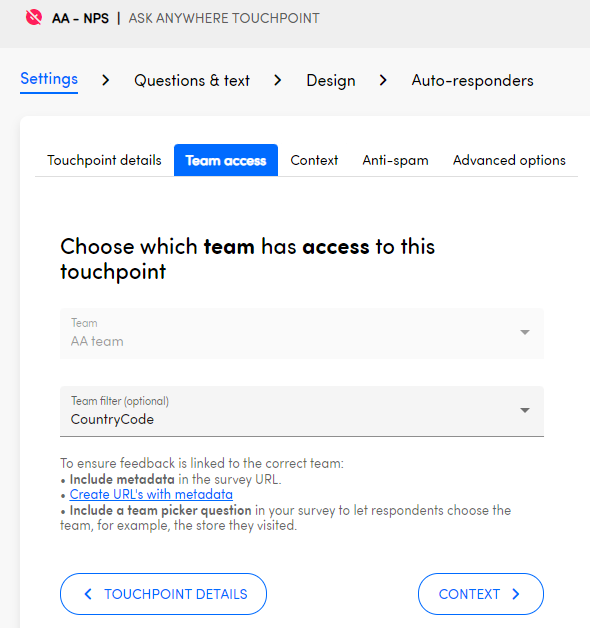 When setting up a team filter it is important to think about the possible metadata keys you can use, this can be anything ranging from 'agent', 'store', 'location', 'closedby',... We always recommend going with the lowest level of metadata as possible, this allows you to build up the entire internal structure in our platform.