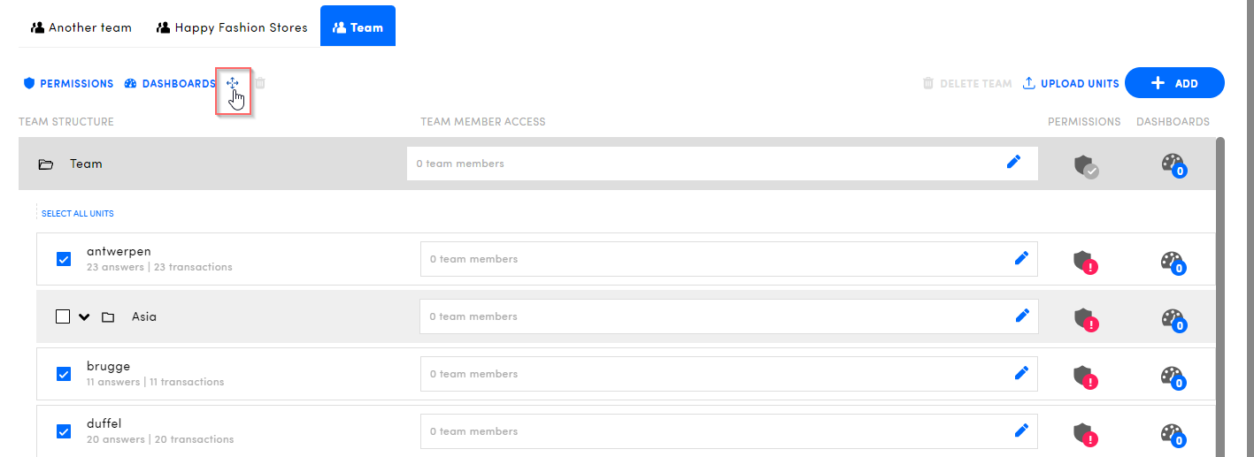 The teams on the lowest level are what we call Units. These units are directly linked via the Team filter to the responses that come in. This team filter is the metadata key that contains the values that become your units.