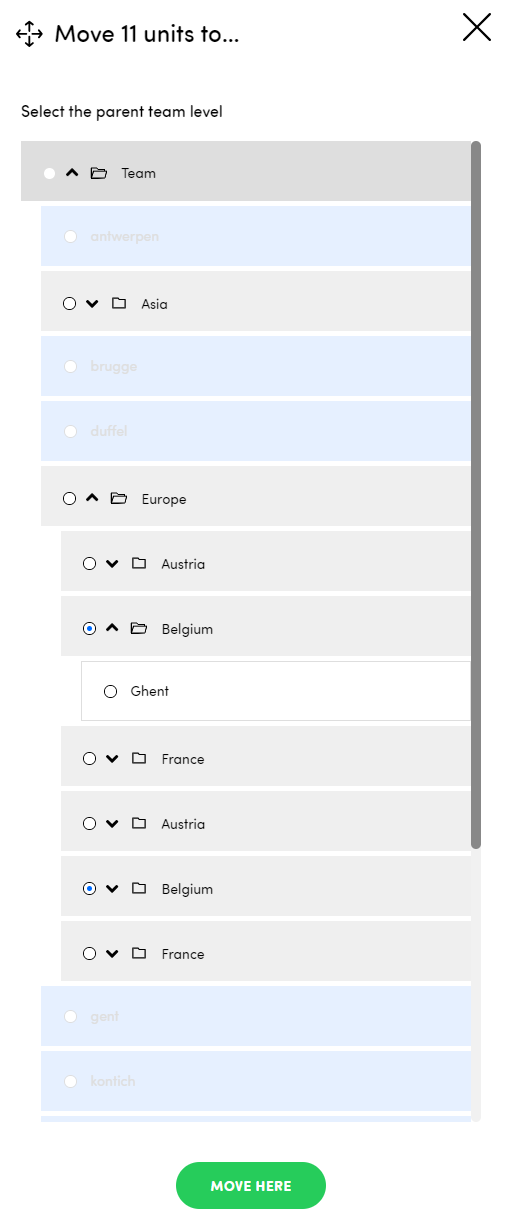 Step 1: Select the unit(s) you want to delete. When you want to delete a sublevel, make sure to first (re)move all the units part of this folder. You can select teams by selecting the checkbox in front of the name. If you want to delete all units below a certain level in once, you can click select all units.