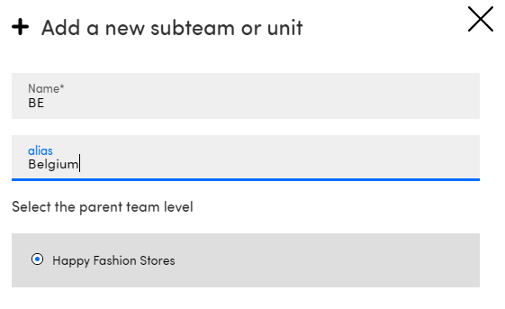 - The alias of the team (optional). An alias can be useful if the name is cryptic, like a code or abbreviation. The alias is used throughout the platform: as a value in the filters, in the team ranking and in questions. For example, if the code for your store in Ghent is BE005, this would appear in the team ranking. If every store has a code, you need to make sure you know the codes to figure out which stores are doing well and which aren't. If you add "Ghent" as an alias, this will replace the code in the team ranking, so it's much clearer which stores we're talking about.
