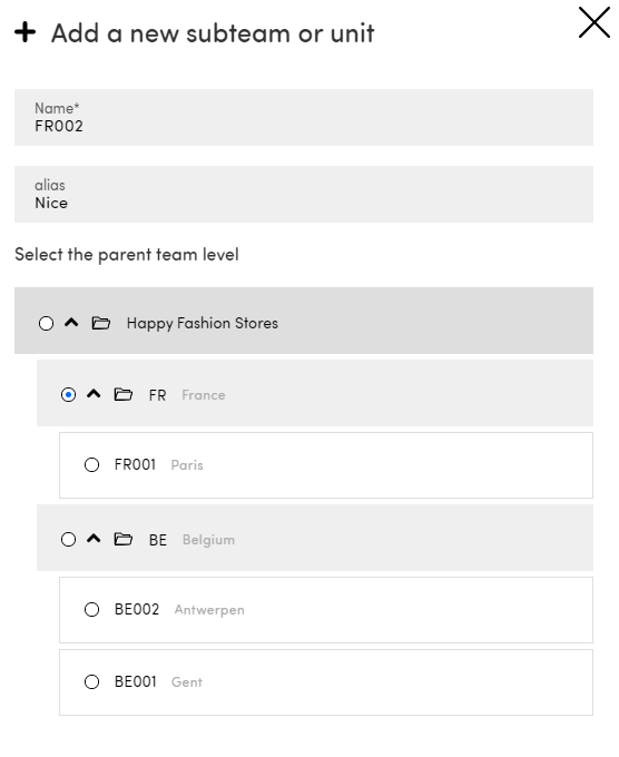 Let's say you're adding the following structure: Brand - Country - Store. In this case, brand would be the top level, which has already been created: Happy Fashion Stores. Next, add all of your countries, then add the stores.