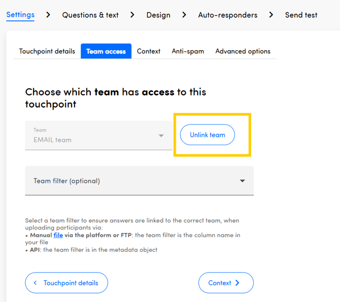 Once you've uploaded a respondent - in case of an e-mail touchpoint - or your first answer came in, the line between the touchpoint and team will become green. Now it's impossible to disconnect them from this part of the platform because data was added to your touchpoint.