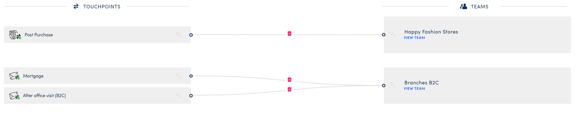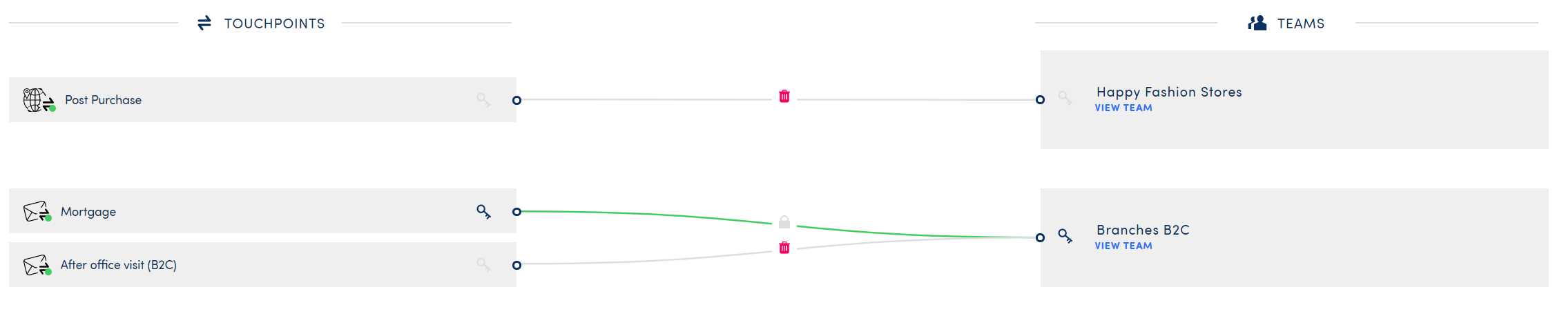 When you initially map out your touchpoints and teams all lines between them are grey and have a red bin icon. At this point, it's still perfectly possible to disconnect the team or to link the touchpoint to another team.