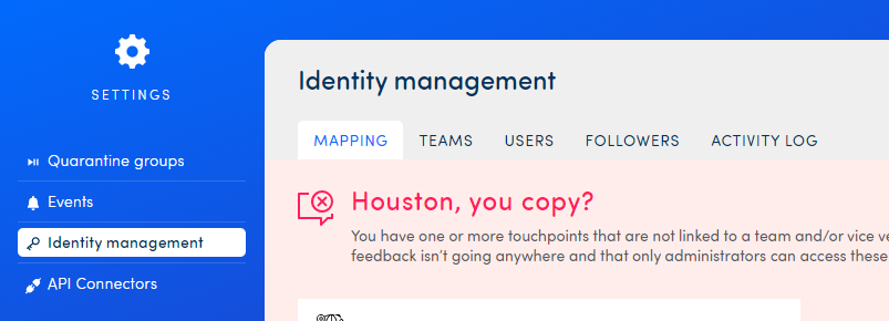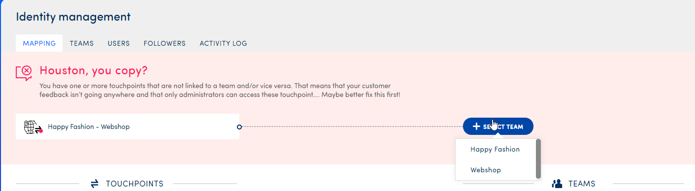 First of all, when you have just created a new touchpoint, you will need to map it to a team. This is mandatory in order to be able to launch your touchpoint. Any touchpoint that has not been mapped yet, will appear at the top of the screen in the red bar.