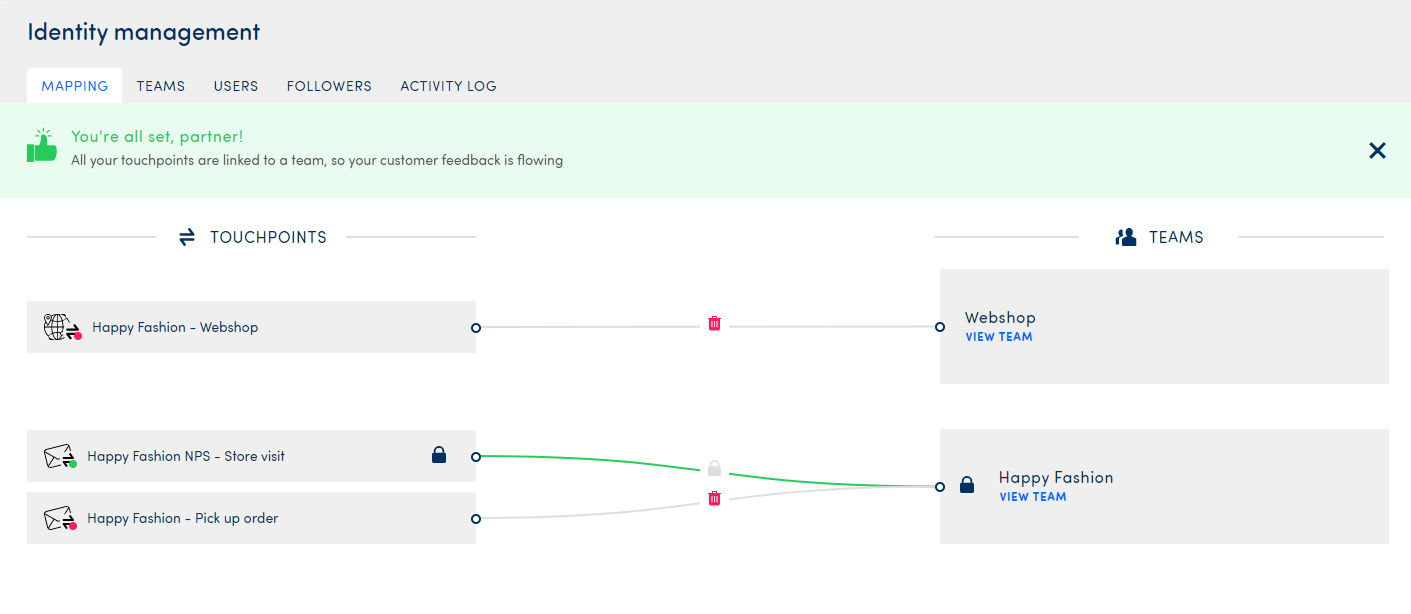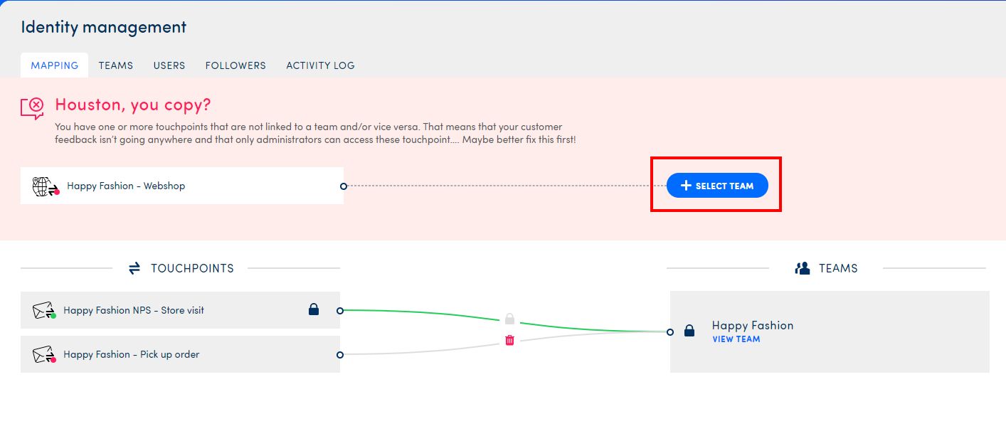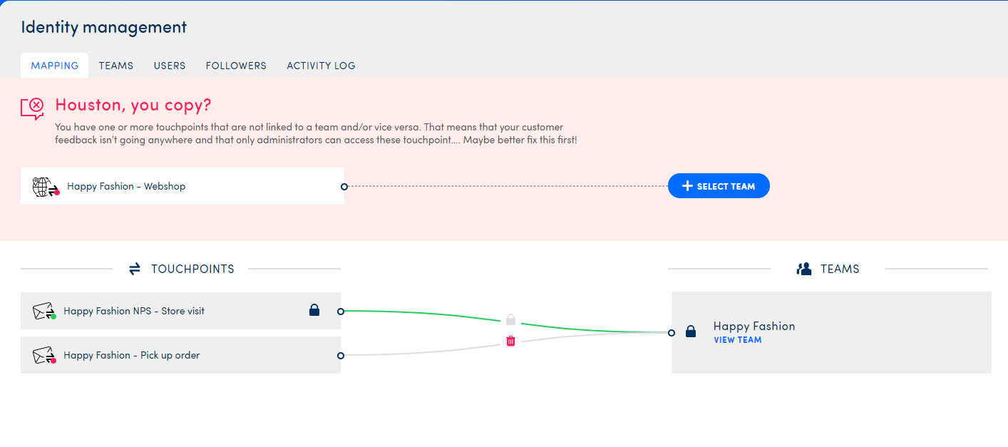 As you can see below, there are 2 touchpoints that have not been locked yet and one that is. The touchpoint Happy Fashion NPS - Store Visit will always be linked to the team Happy Fashion.