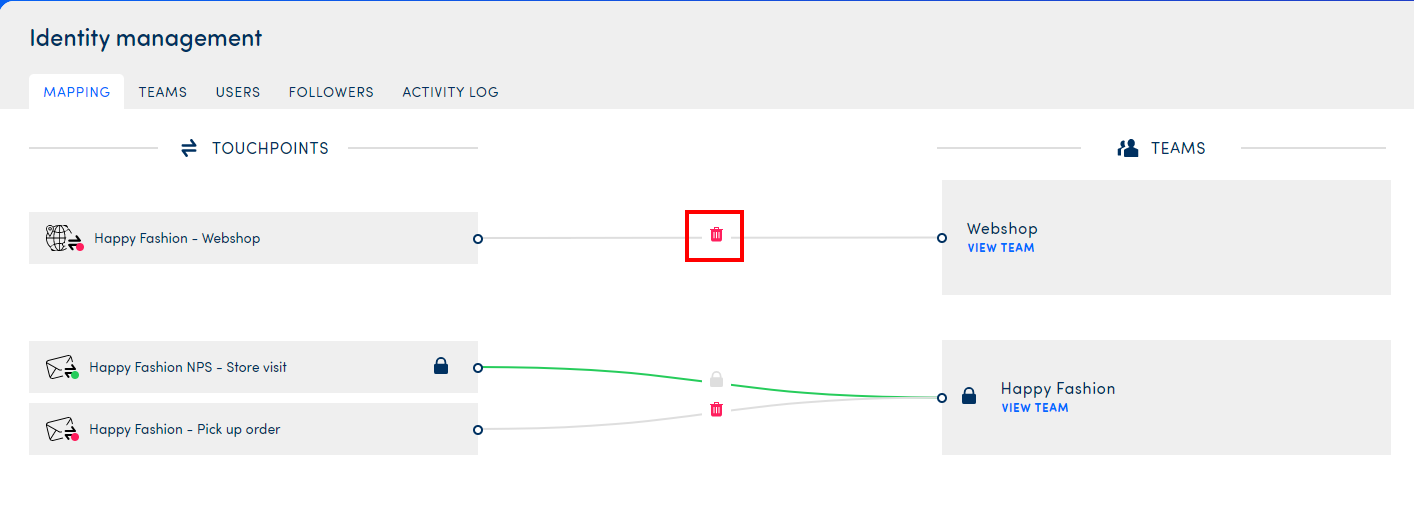 The other 2 touchpoints can still be unlinked and eventually mapped to another team. To unlink a team, click the Bin Icon in the middle.