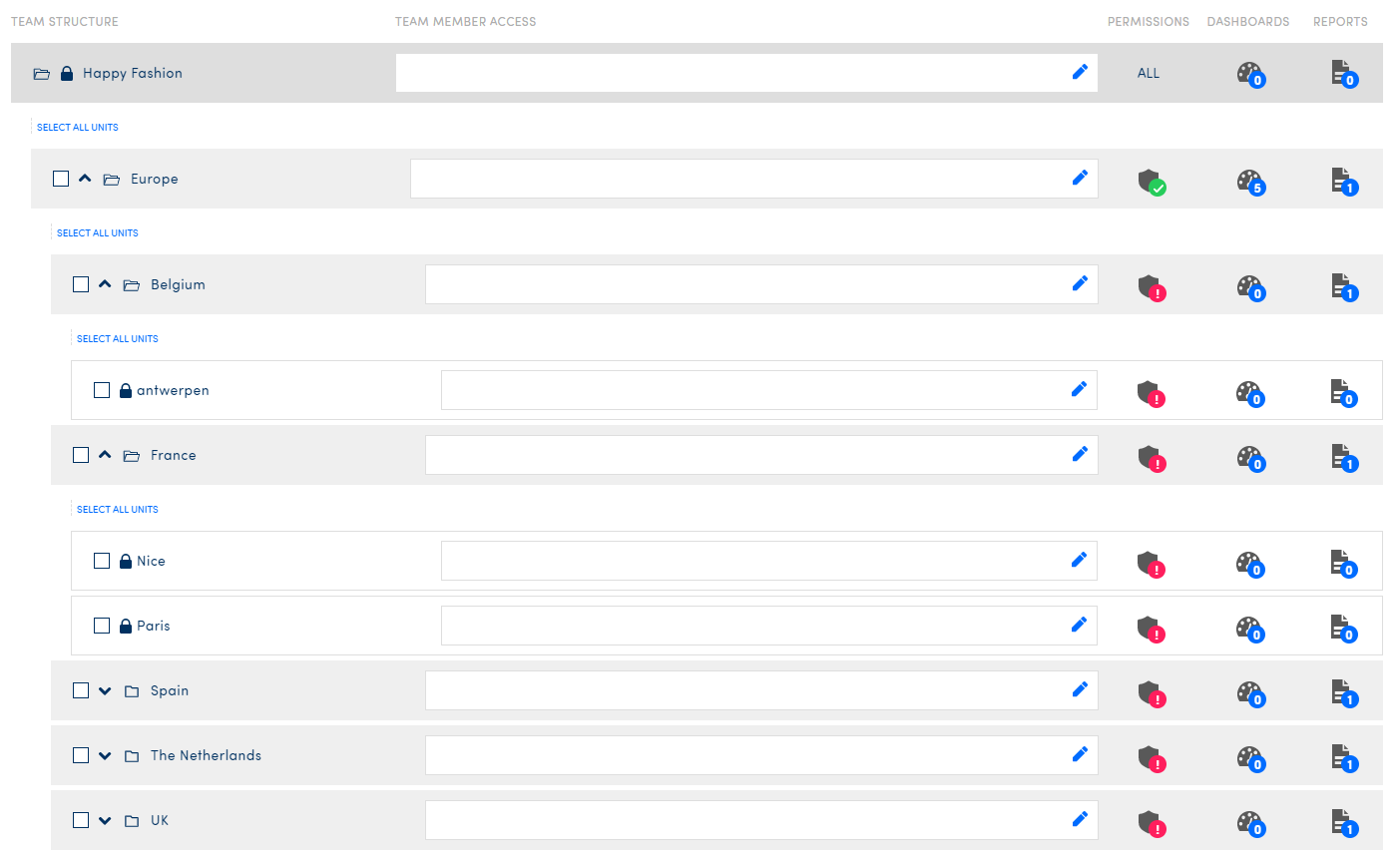 Below your top level, you can add as many sub levels as you like and create a type of folder structure. The easiest way to comprehend this would be to go back to our retail example and create a structure of stores or offices, with different regions and countries. In this example, our brand is called Happy Fashion and we have a number of stores spread around Europe, like this: