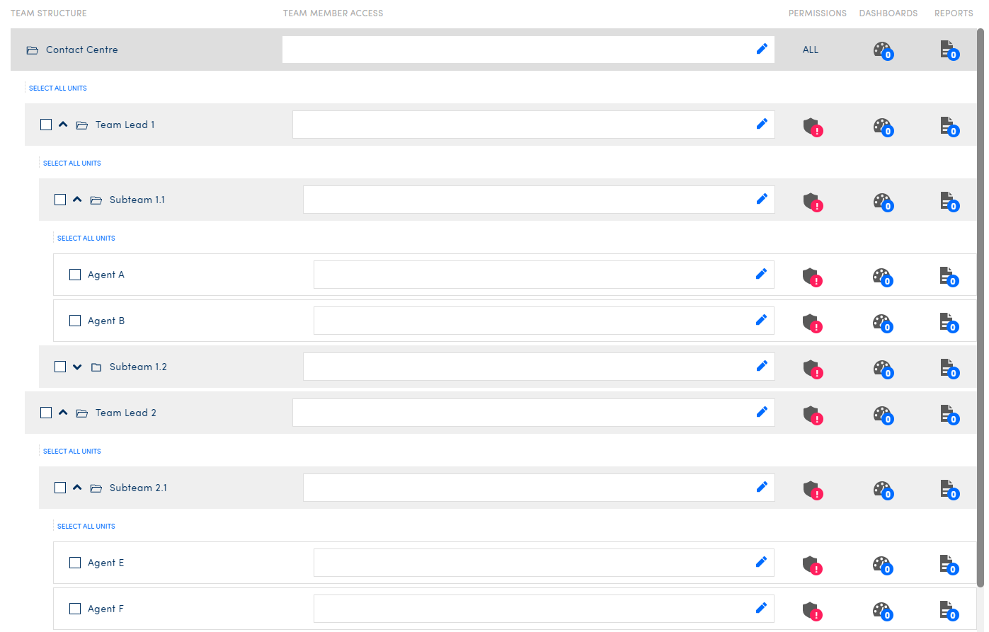 As we said, this is just one example to understand what it would look like. If we would go back to our example of the contact centre, you could create another team with a similar structure that goes Contact Centre (Top level) > Team Lead > Sub team > Agent, which would look something like this: