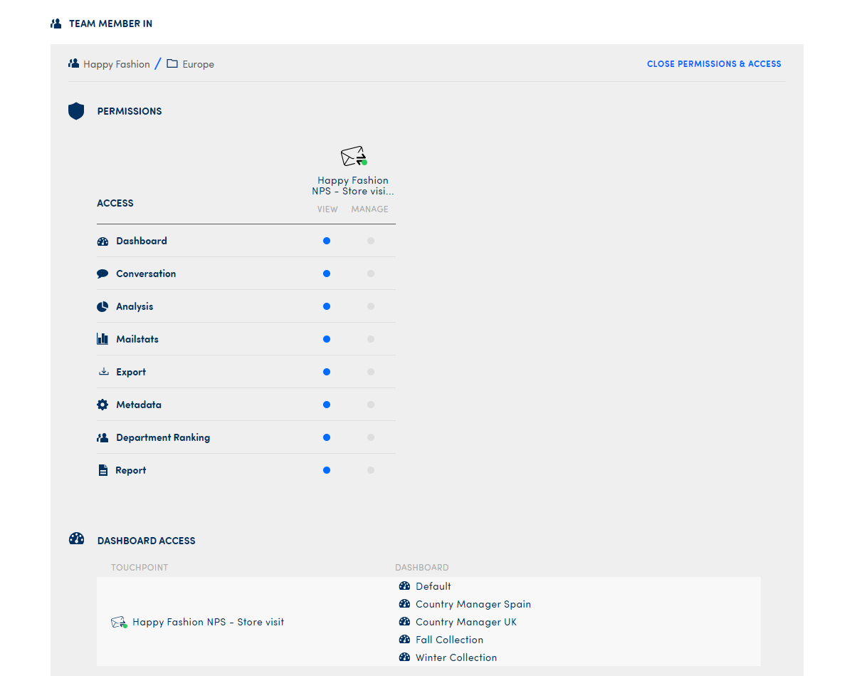 So if we go back to the Happy Fashion example, if a customer bought something in your store in Nice and they gave feedback, this feedback will be linked to the lowest level: the store Nice. Because of this, it will automatically also be visible for any levels above: France, Europe and Happy Fashion. Because of the data being linked, you can now do and see a number of things in the platform.