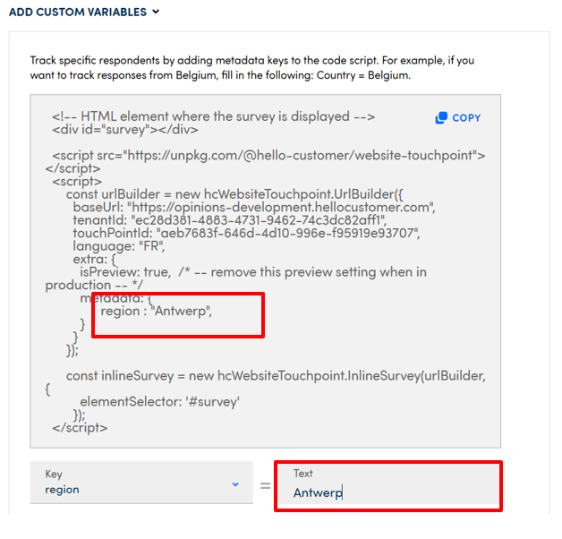 This parameter must be removed by the customer when the survey goes into production. When changing the type of website touchpoint, changes will also be made in the code snippet. This will therefore have to be copied again to ensure that the survey is displayed properly.