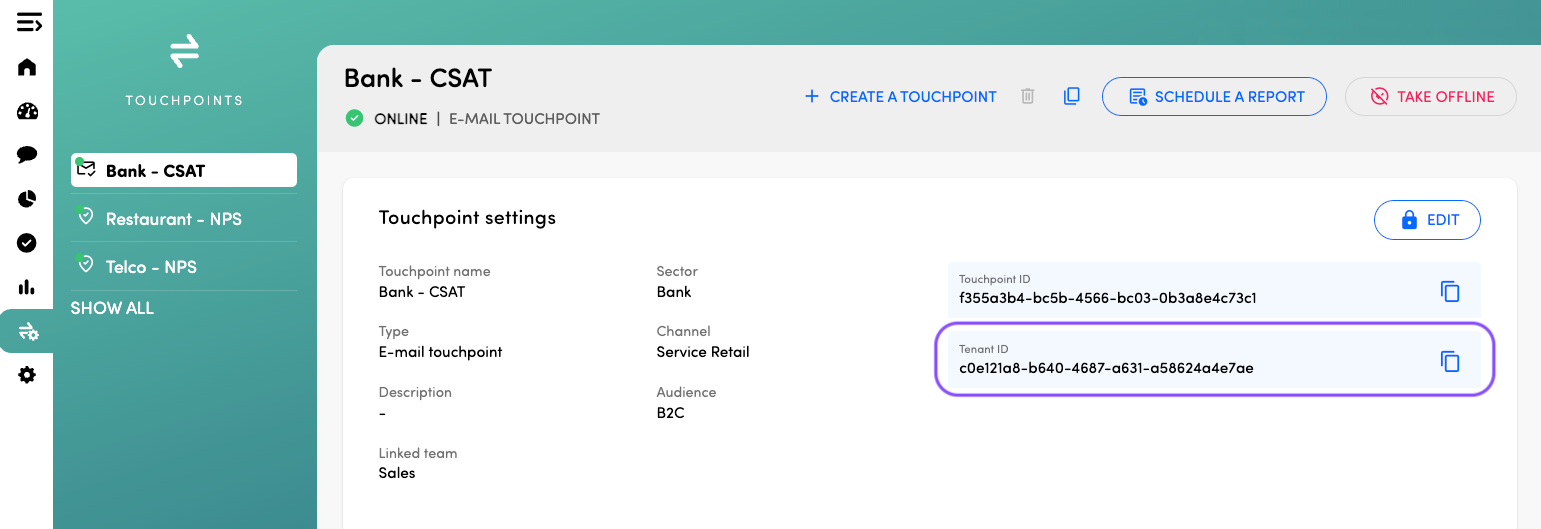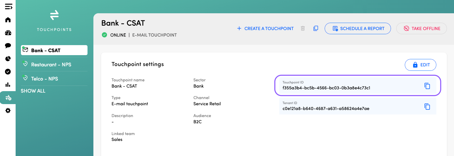 You can find this in 'Touchpoints' in the 'Touchpoint settings' panel. Use the duplicate icon to easy copy the touchpoint unique id.