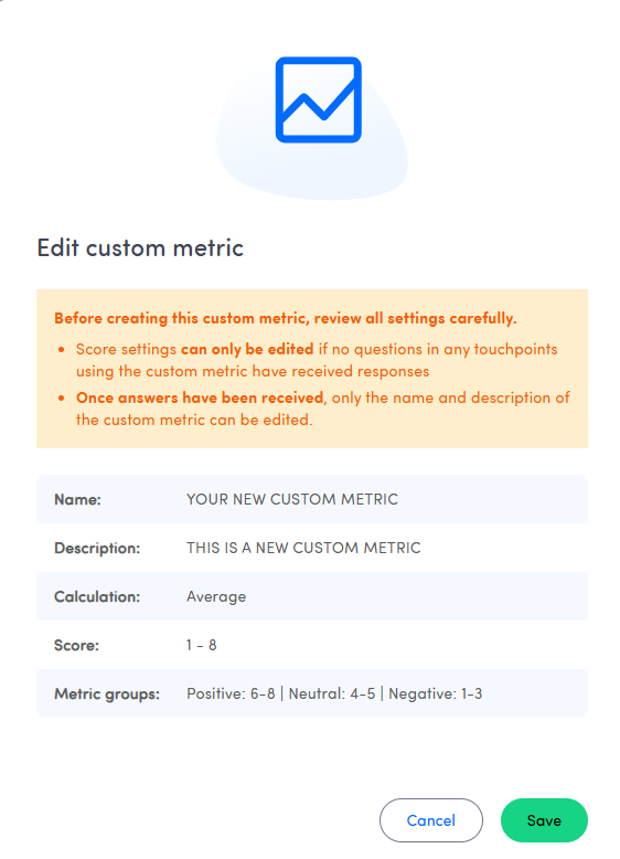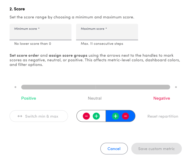 The score section (score range, score groups and soon the calculation method) can only be edited if there are no answers for the custom metric in any touchpoint