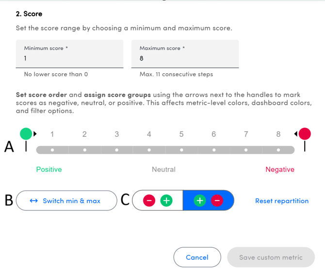 - A: Define the score groups (positive, negative and neutral) by moving the lollipops along the score range