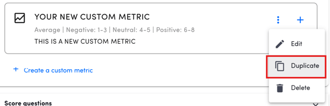 Custom metrics can be duplicated by clicking on the three dots right next to the + icon in the question selection dialogue and selecting Duplicate.