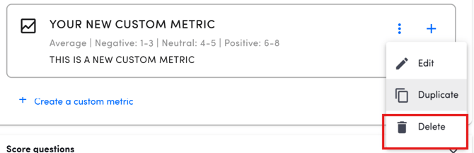 Custom metrics can be deleted by clicking on the three dots right next to the + icon in the question selection dialogue and selecting Delete.