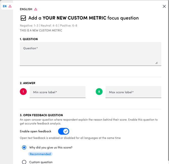 The "+ Create a custom metric" option will appear" when adding a new question to the touchpoint. You just need to click here in order to start configuring your new Custom Metric: