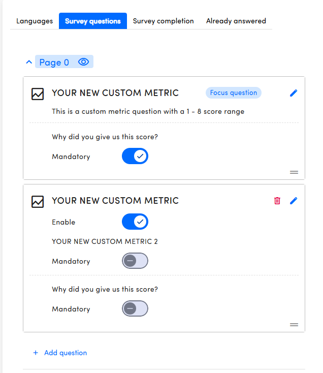 You can add as many of the same custom metric as you want! But only the first one will act as the focus question and the one that will appear on the homepage.