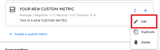 Custom metrics can be edited by clicking on the three dots right next to the + icon in the question selection dialogue and selecting Edit.