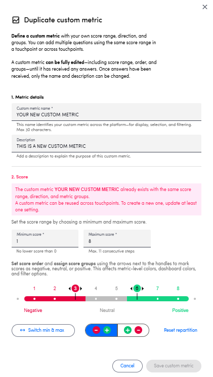 A new modal dialogue will appear in order for you to configure the new duplicate. This is because there cannot be two custom metrics with the exact same configuration for the score section (i.e. same score range, score groups and calculation method)