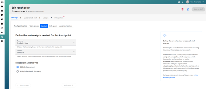 Selecting the context of your touchpoint is crucial to optimize the effectiveness of ISAAC, our text analysis AI.