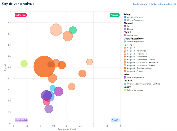 With the key driver analysis we try to pinpoint what really matters to your customers and what can be linked to their score, namely what is related to people recommending your company (NPS), your customer satisfaction (CSAT) and customer effort score (CES). We give you a prioritization of which issues you should tackle first: the ones your customers are unhappy about and have an impact on your metric (NPS / CSAT / CES) score.