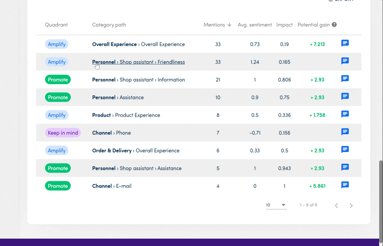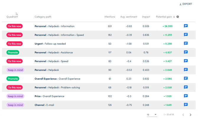 In the table, all topics are listed with all details about amount of mentions, correlation, average sentiment and the potential gain. Learn more about the potential gain in the next section. Next to each topic, the quadrant of the category path is specified so it is immediately clear which priority you should give to this topic. It is possible to sort on each column by clicking on the column title. It is also possible to make an export of this data to use it for internal reporting.