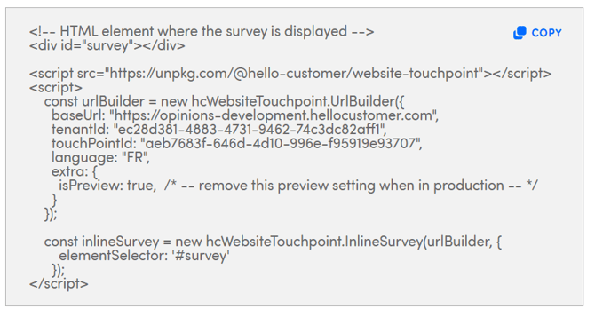 This parameter must be removed by the customer when the survey goes into production. When changing the type of website touchpoint, changes will also be made in the code snippet. This will therefore have to be copied again to ensure that the survey is displayed properly.
