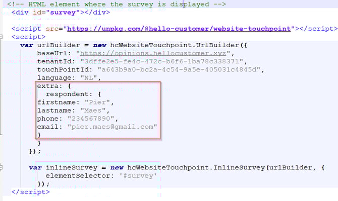 You can also add personal data about the person who responded to your survey in the code snippet. You can add following information: