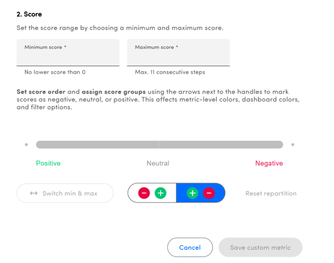 We’ve introduced Custom Metrics, a new metric question type that gives you full control over how scores are defined and presented. You can configure score ranges, groupings, polarity (positive to negative or the reverse), and the display order of score buttons. This flexibility unlocks new measurement use cases and enables more precise data collection across your surveys.